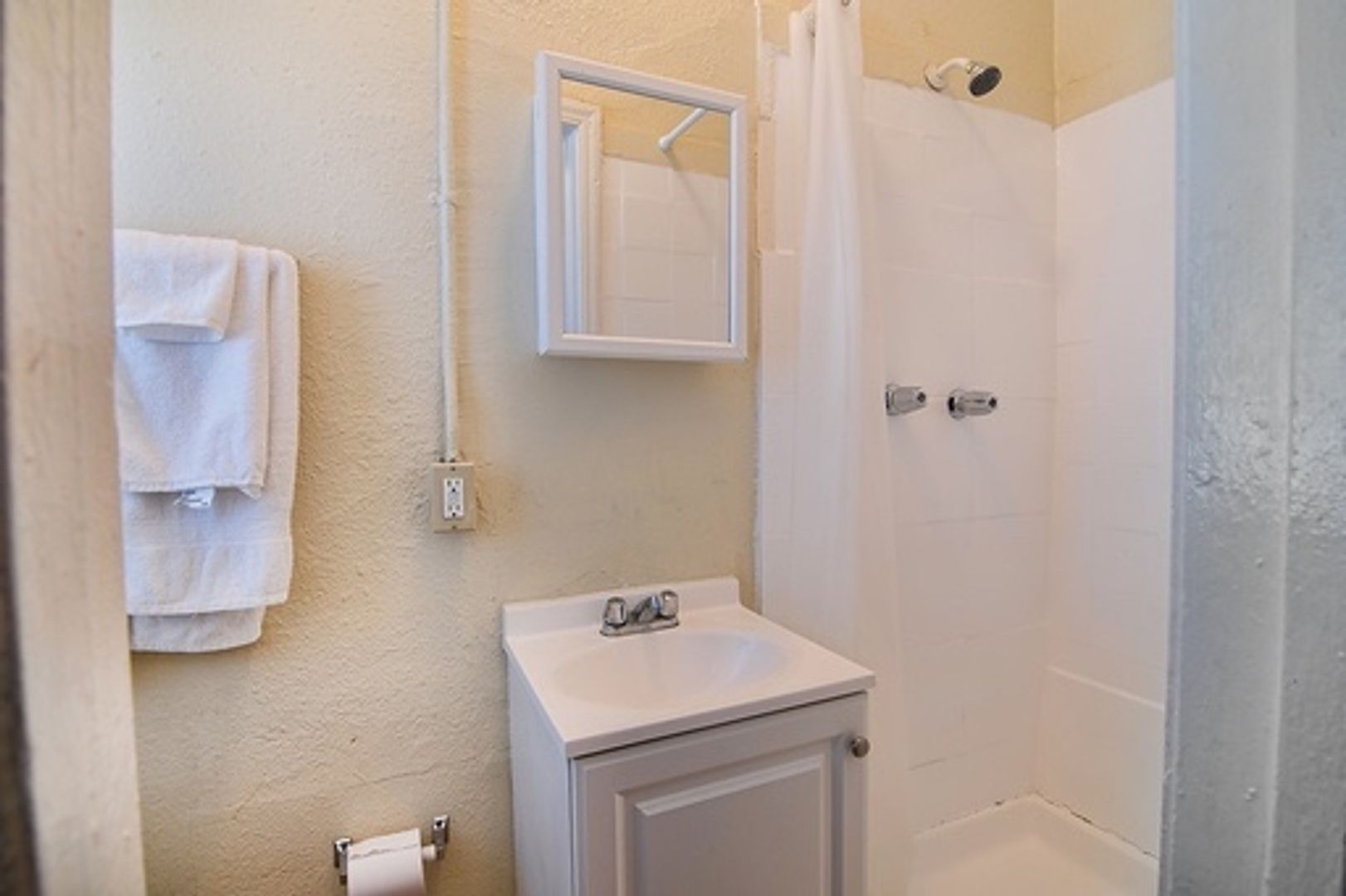 Studio apartment with full bathroom; kitchen with open floor plan: